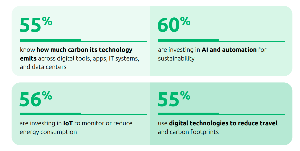 Le aziende sono più consapevoli dell’impatto ambientale della loro tecnologia e fanno leva su nuovi strumenti per raggiungere i loro obiettivi. Più della metà dei dirigenti (55%) afferma che la propria azienda è consapevole della quantità di anidride carbonica emessa dalla propria tecnologia (strumenti digitali, app, sistemi IT e data center), percentuale che raggiunge il 63% nel settore della produzione industriale e il 61% in quello dei prodotti di consumo e dell’energia. Per raggiungere i propri obiettivi di sostenibilità, il 58% delle organizzazioni afferma di utilizzare l’intelligenza artificiale e l’automazione, in particolare nel settore dell’energia (72%), mentre oltre la metà delle aziende a livello globale (54%) sta investendo in tecnologie digitali come AR/VR o strumenti di collaborazione per ridurre gli spostamenti dei dipendenti.