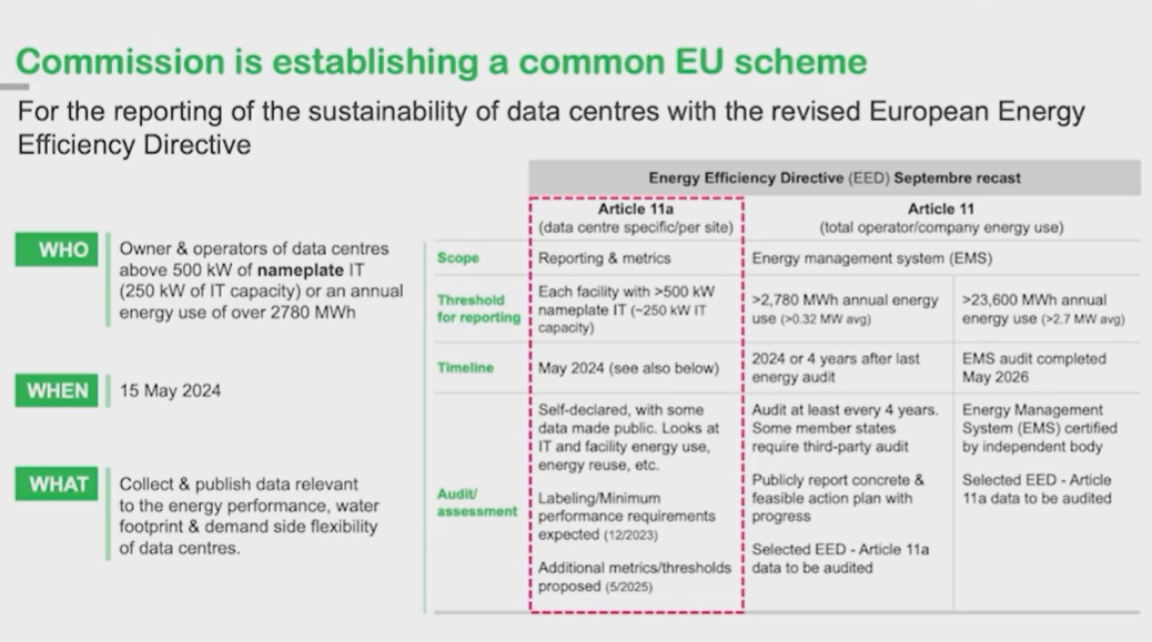 Non stupisce quindi la spinta crescente verso le legislazioni ad hoc per disciplinare le misure per la sostenibilità, anche con certificazioni uniformi. L’Europa sta guidando questa spinta, evidenzia Alison Matte, “anche perché il 2,7% del consumo totale di elettricità in Europa è legato ai data center, e questo ha portato l'UE a istituire uno schema comune per la segnalazione della sostenibilità dei data center attraverso la revisione della EED avvenuta a settembre scorso, che prevede, in sintesi, che entro il 15 maggio 2024 tutti i proprietari o gli operatori di data center con una potenza nominale superiore a 500 kilowatt o circa 250 kilowatt di capacità IT devono iniziare a segnalare, raccogliere e pubblicare dati pertinenti sul consumo energetico, le prestazioni energetiche e l'impronta idrica dei loro data center, con uno schema di rendicontazione su 25 parametri chiave”.
