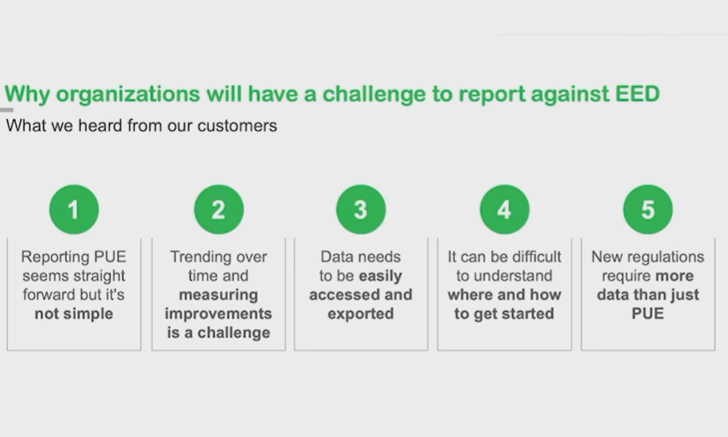 Misurare, tracciare e riportare tutte le metriche di sostenibilità legate ai data center e all'infrastruttura IT è sicuramente un compito non privo di complessità, come racconta Kevin Brown, Senior Vice president Ecostruxure Solutions di Schneider Electric: “abbiamo interpellato i nostri clienti, che ci hanno fatto individuare le cinque sfide principali che si troveranno di fronte nel produrre i report in conformità con la EED: il reporting del PUE, il noto Power Usage Effectiveness, sembra semplice ma nella realtà non lo è; seguire i trend nel tempo e misurare i miglioramenti può essere complesso; i dati devono essere facilmente accessibili ed esportabili; può essere difficile capire dove e come iniziare; e infine le nuove normative richiedono più dati che vanno oltre al solo PUE”.