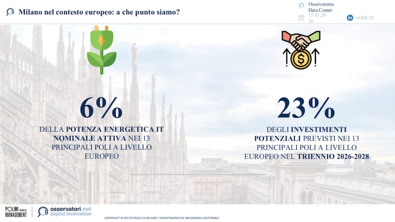 Sono i dati principali dell’edizione 2026 dell’Osservatorio Data Center del Politecnico di Milano, un rapporto che fin dal titolo (“Dal rumore al valore: l’Italia come nuovo Data Center Hub europeo”) punta a mettere in luce la forte dicotomia che caratterizza oggi questo mercato.