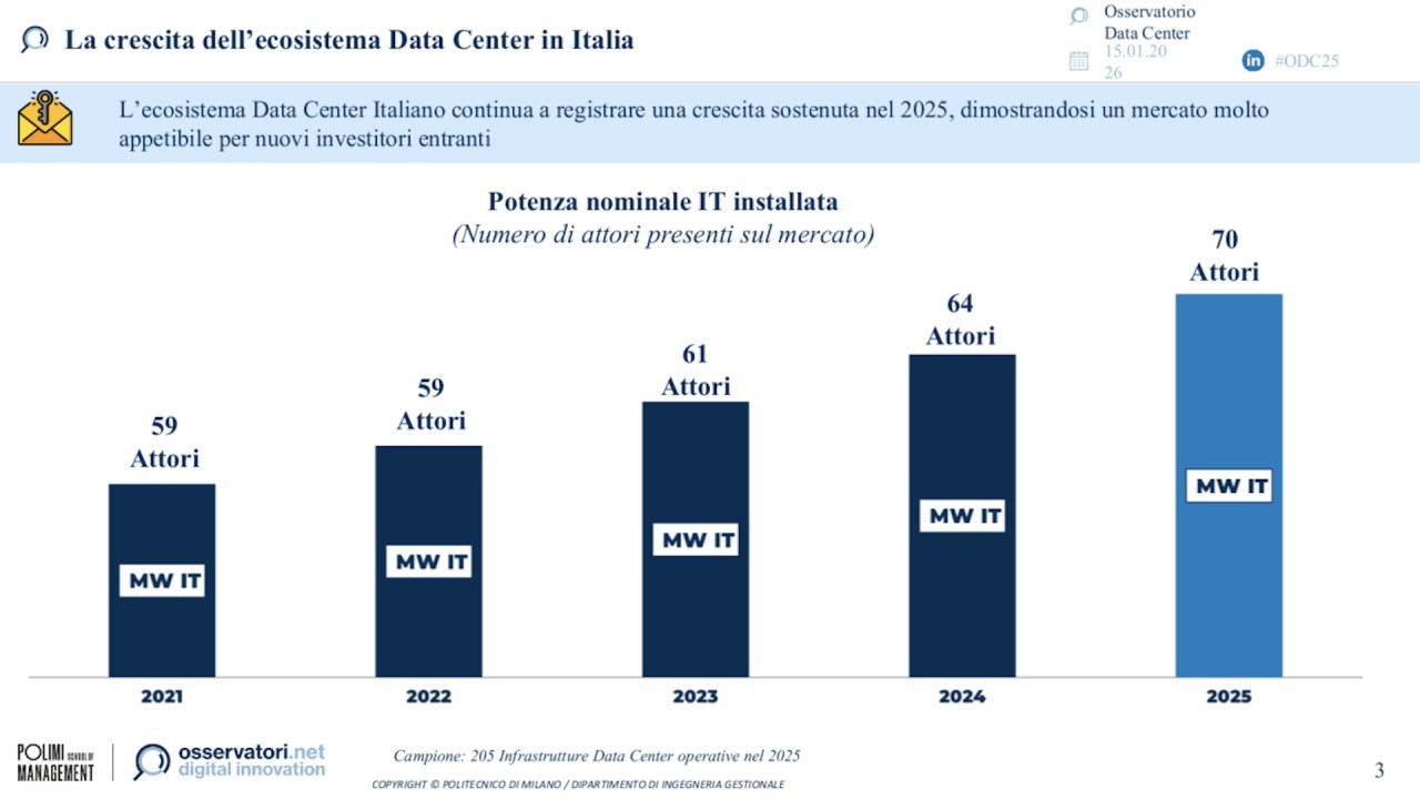 Continua in Italia la forte crescita del mercato dei Data Center. Negli ultimi tre anni sono stati investiti 7,1 miliardi di euro nella costruzione e dotazione di queste strutture, che nel 2025 hanno raggiunto una potenza nominale installata di 609 MW IT (cioè MW calcolati tenendo conto solo delle sale dati dei Data Center), in crescita del 19% annuo, mentre il numero di operatori attivi è salito da 64 a 70.