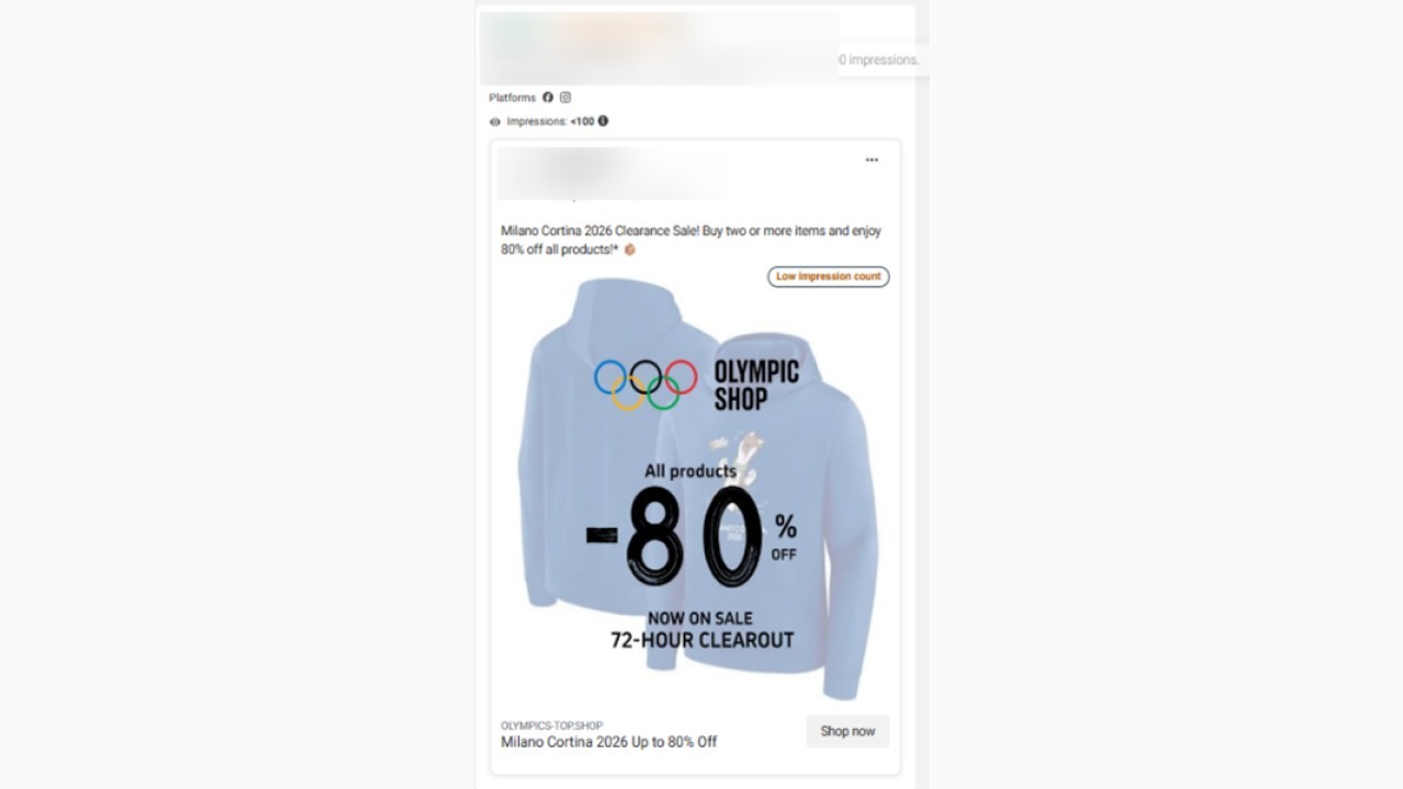 Bitdefender Labs sta monitorando una campagna fraudolenta attiva che fa leva su annunci pubblicitari fasulli nei quali vengono promossi sconti fino all’80% sui presunti prodotti ufficiali di Milano-Cortina 2026.