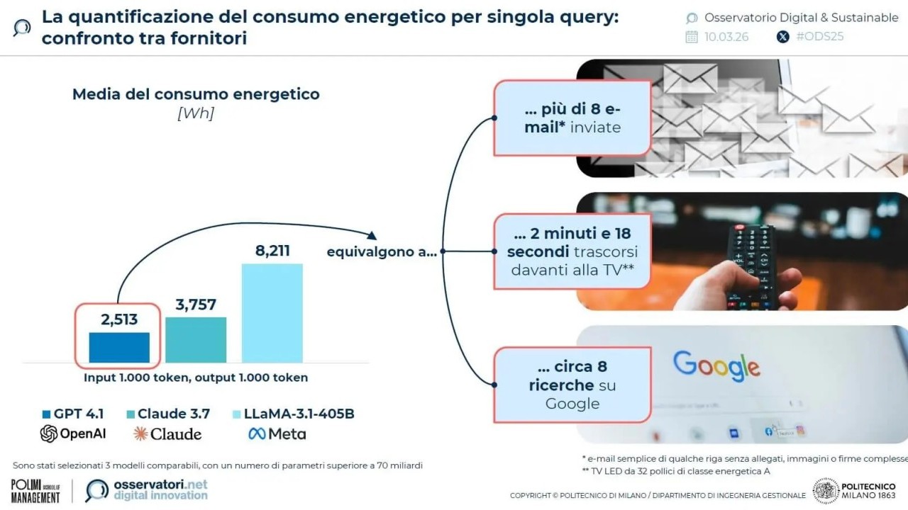 Meno consapevolezza c’è sull’uso dell’AI. Nel 2025 circa 2 internet user su 3 hanno utilizzato un sistema di Generative AI, spesso come sostituto dei motori di ricerca. Ma le due attività non sono equivalenti in termini di impatto ambientale, ammonisce l’Osservatorio: una richiesta media a ChatGPT 4.1 - che oltretutto secondo i ricercatori del Polimi risulta più efficiente in termini di consumi rispetto a Claude 3.7 e LLaMA-3.1-405B - consuma circa 8 volte l’energia che verrebbe utilizzata facendo una ricerca su Google senza utilizzare l’AI.