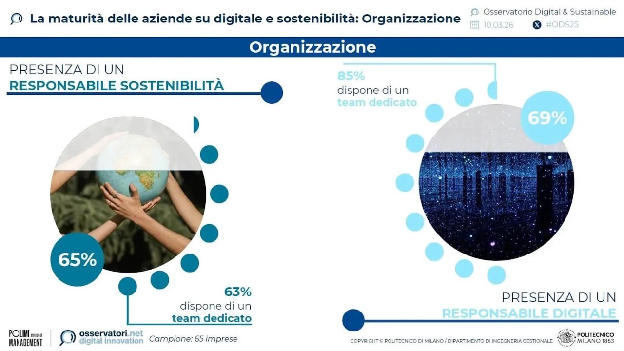 Un secondo è la maturità delle aziende italiane nell’adozione delle tecnologie digitali e nell’integrazione dei principi di sostenibilità nel loro business. In sintesi il 78% investe intensamente in entrambi i campi, ma poche li affrontano in modo sinergico: il 64% utilizza il digitale per raggiungere obiettivi ambientali, sociali e di governance, ma solo il 42% si fa guidare dalla sostenibilità nelle scelte tecnologiche. Due aziende su tre hanno un responsabile per la gestione dell’innovazione digitale o della sostenibilità, ma solo il 6% ha una persona dedicata alla sinergia tra digitale e sostenibilità.